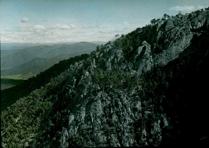 Black and white image looking north into the valley from Mt Buffalo, photographed by A.J. Campbell.