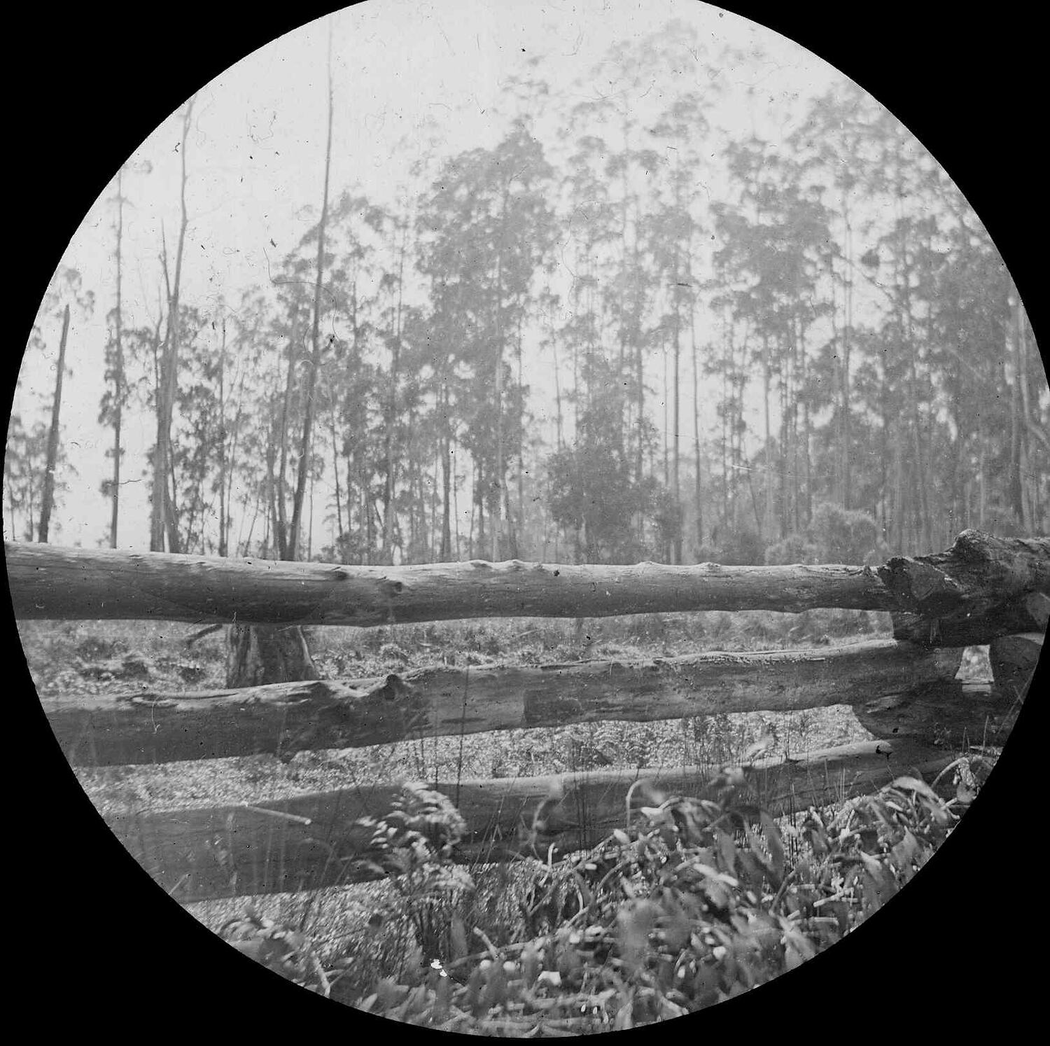 Black and white image of an early log fence possibly in the Gippsland region, photographed by A.J. Campbell.