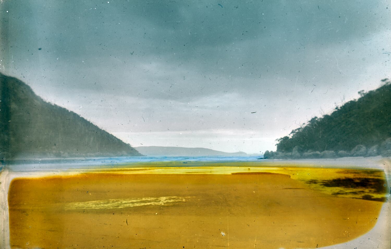 Colour image of Sealers Cove when the tide was low exposing the silt deposits of the creek, photographed by J.K. Campbell, grandson of A.J. Campbell.