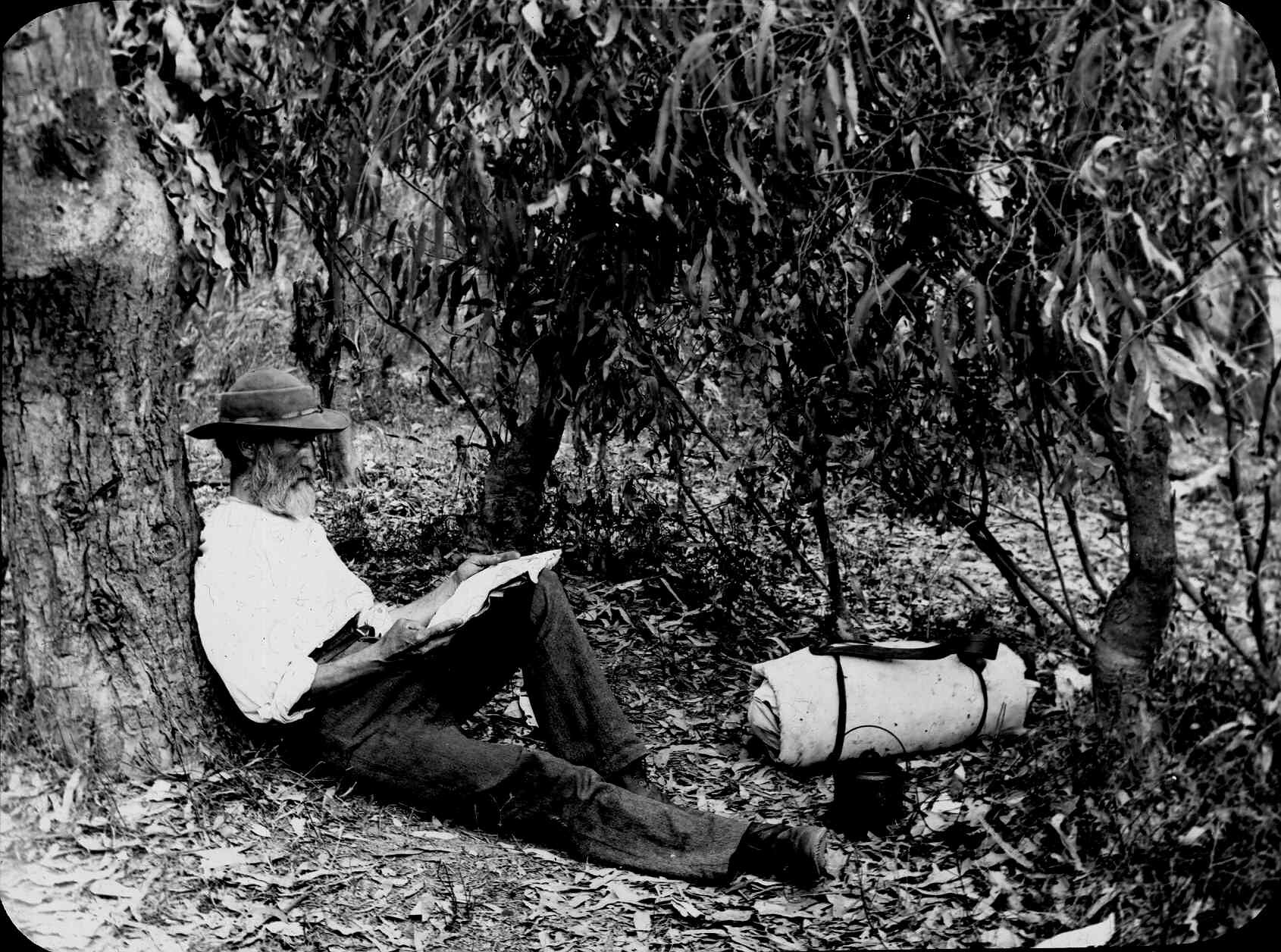 Black and white image of a swagman taking a rest in the bush, photographed by A.J. Campbell.