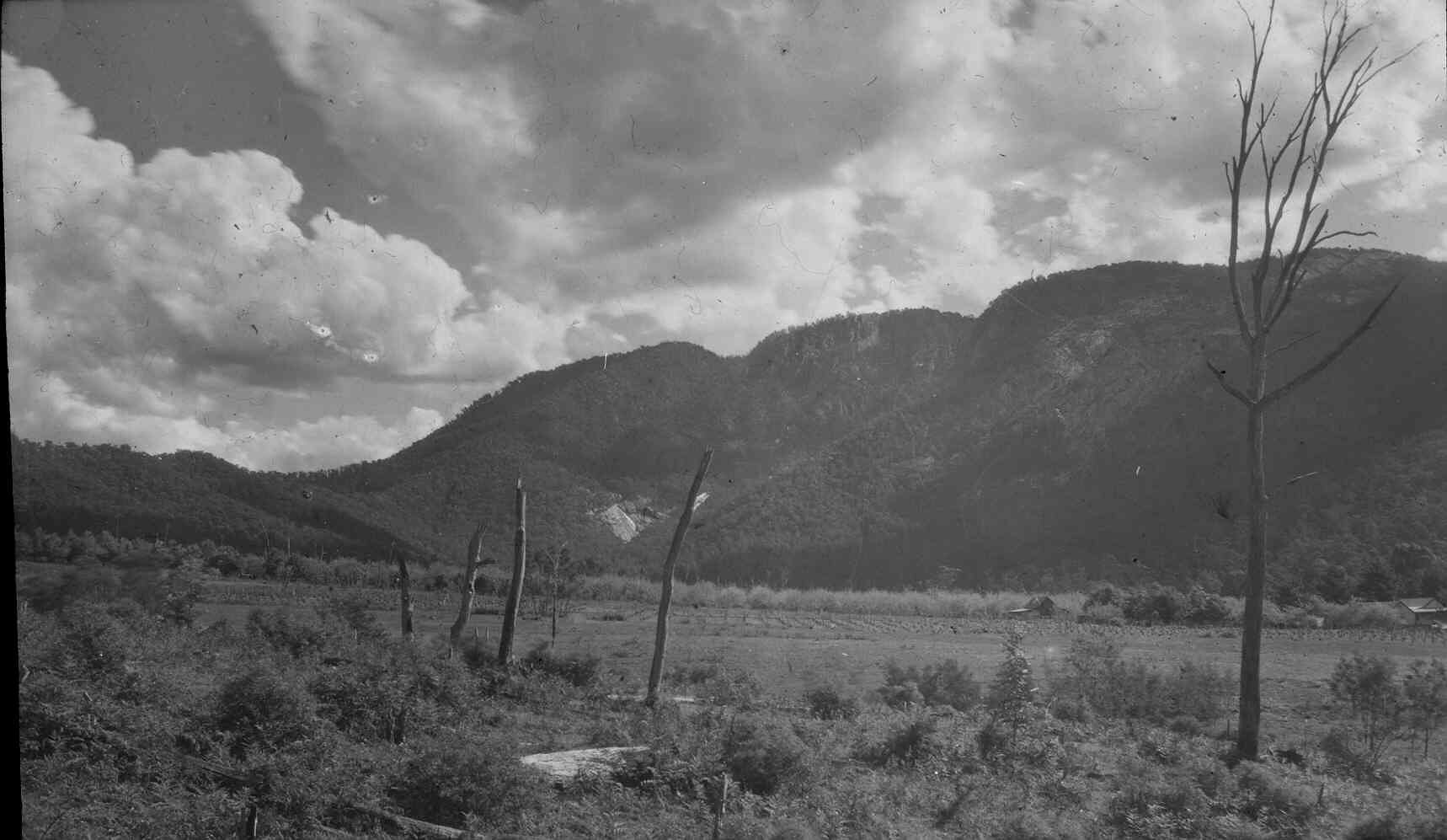 Black and white image of Mt Buffalo as seen from the valley below, photographed by A.J. Campbell.