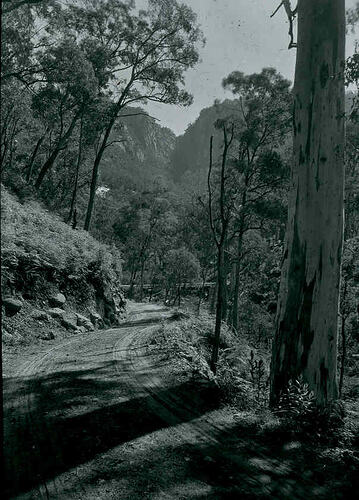 Black and white image of the newly constructed road to Mt Buffalo, photographed by A.J. Campbell.