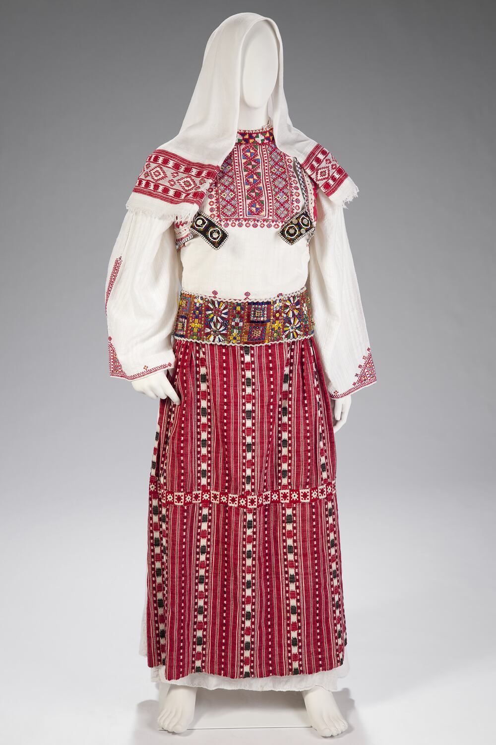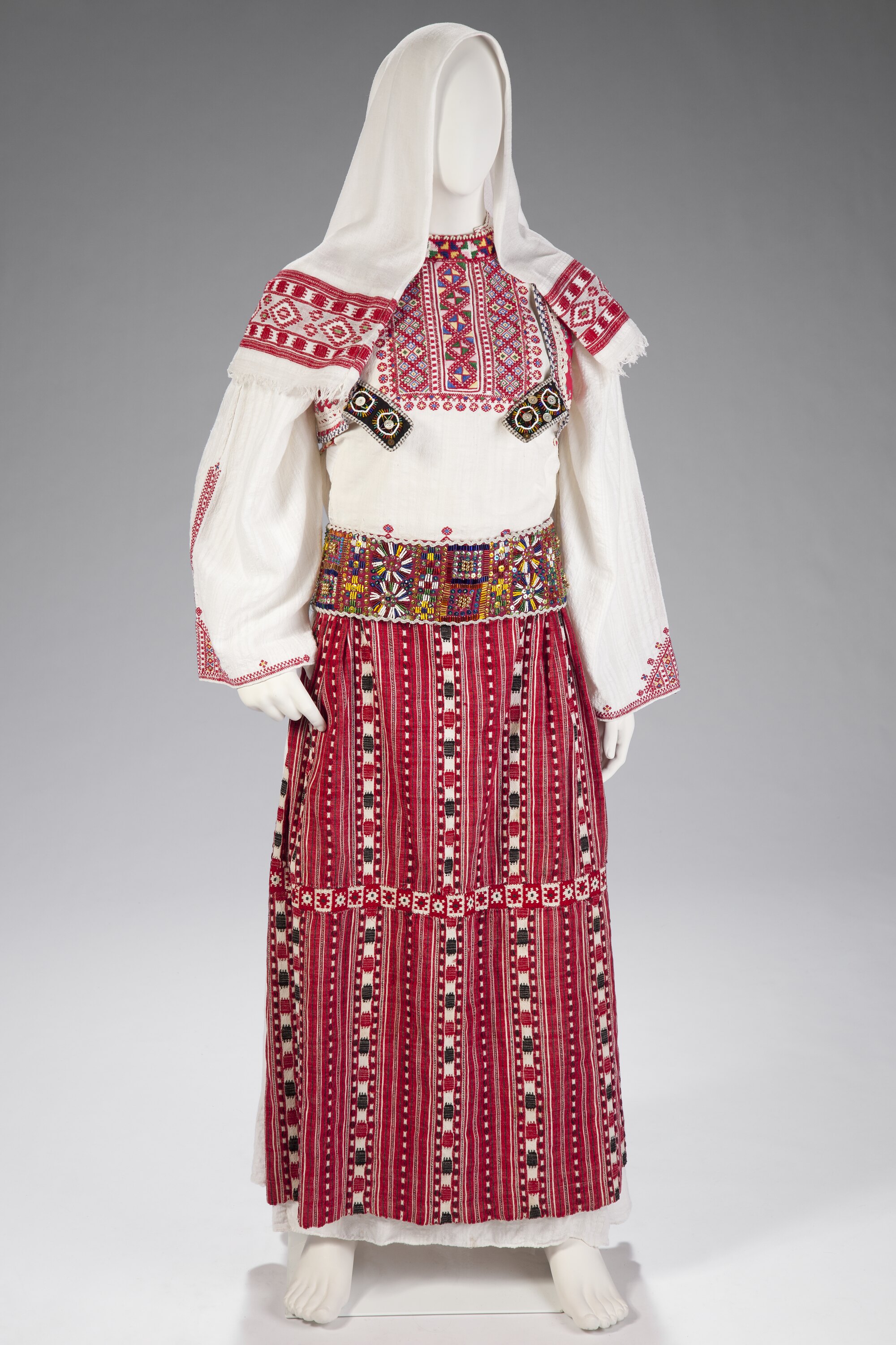 This is a special occasion costume worn at weddings, engagements and sacred cultural ceremonies. It is a simple style of dress, enhanced through a variety of decorative elements including textures, weaves, and colours. The costume would traditionally have been further adorned with decorative jewellery, usually in the form of a coin necklace. This jewellery would have been presented to the wearer on special occasions and placed in an embroidered wool woven tote, made to hold gifts and items when attending functions in distant villages. The dress apron and scarf enable the wearer to continue their domestic duties while remaining respectably attired, according to the requirements of Albanian society of the early 1900s.