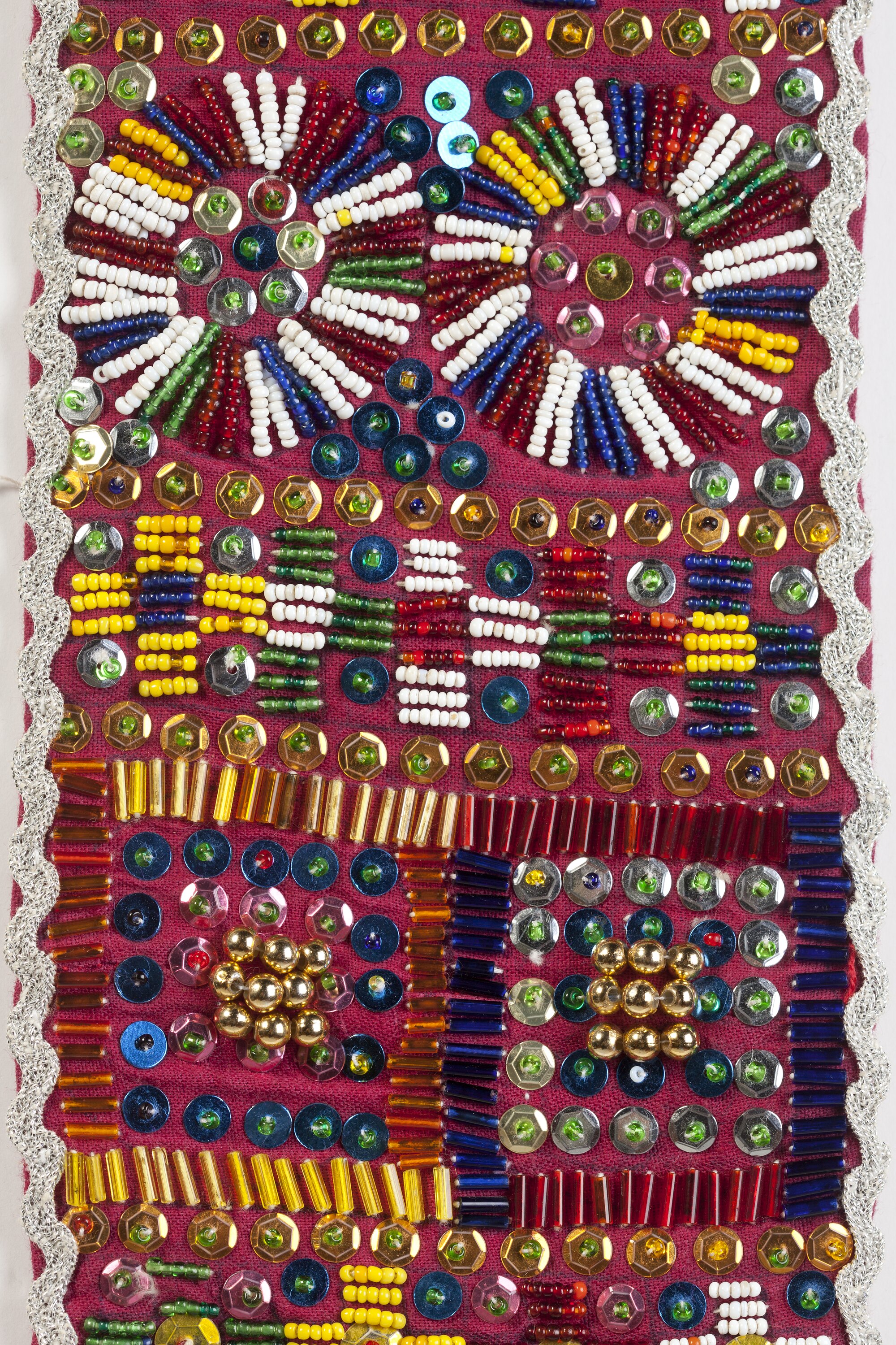 Beaded and sequined belt on red fabric with silver thread edging and wool tassel edge and each end.