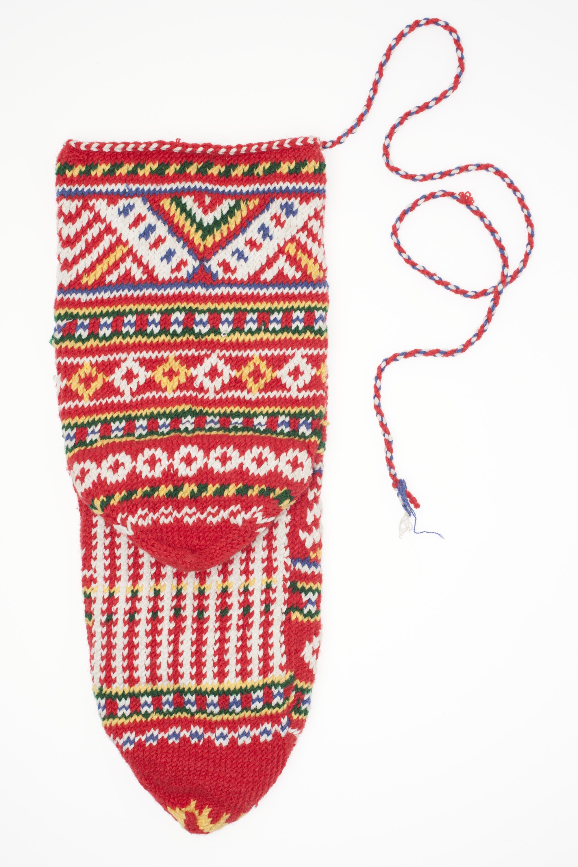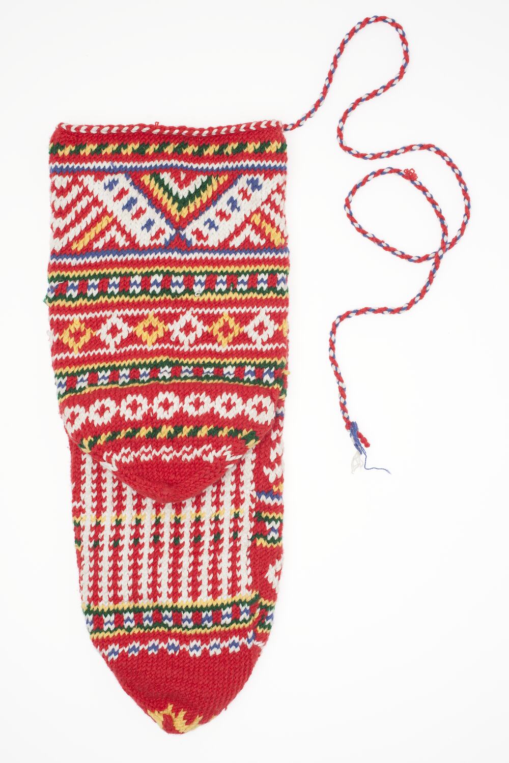 Acrylic woollen sock, predominantly red with white, blue, green and yellow pattern. The toe and generous heel come to a point and there is a long string attached at the top.