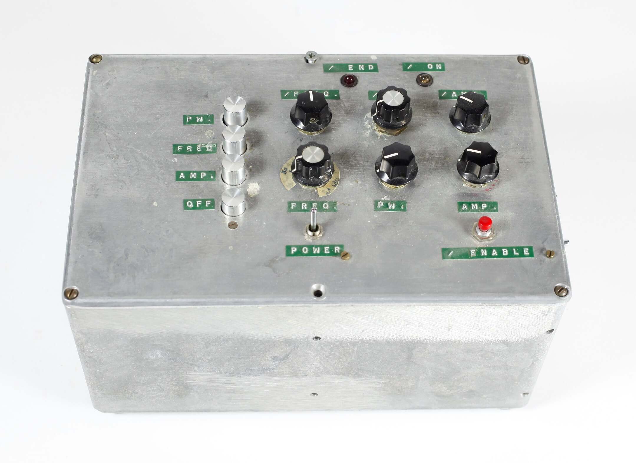 Silver box with 6 black dials, buttons, switches, LEDs.