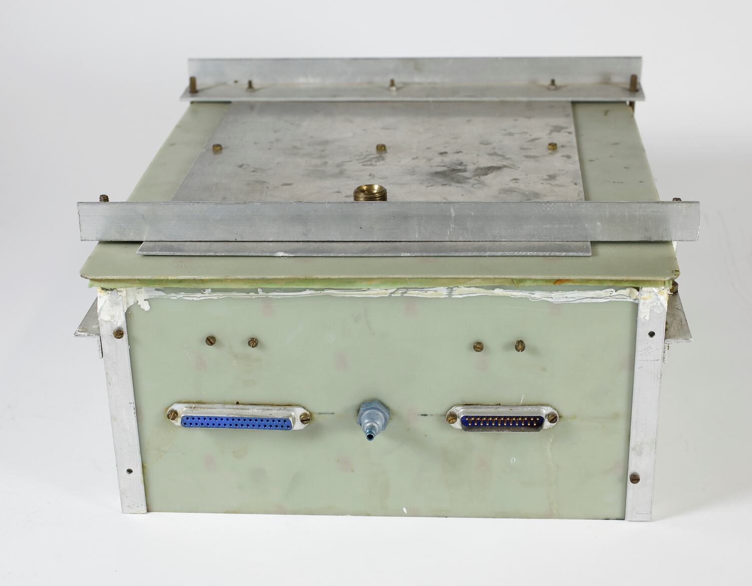 Pale Greenish metal box with blue metal valve on side and coloured cables inside. There is a printed & hand written sticker on the base.