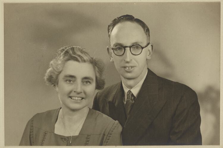 Black and white portrait of George and Gertrude Palmer, taken in England around 1946-47. It was brought to Australia by George Palmer when he migrated to Australia from England with his wife Gertrude and their two daughters, Shirley and Lesley in 1947.
