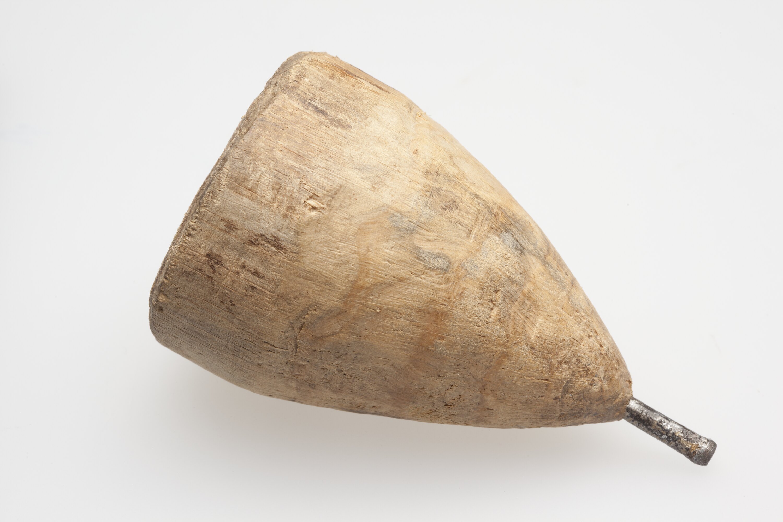 Wooden spinning top made by Marcello D'Amico in 1954 in small village on the island of Stromboli, Italy when he was fourteen years old. Marcello's father was a builder so he had access to tools and supplies. He made the top using local hard wood and used a chisel to shape the wood then rubbed it down with a rasp to smooth it. A nail was then hammered into the pointed end of the top. Spinning was mainly a boys' game, with boys starting at seven or eight years old and continuing until their adult years.