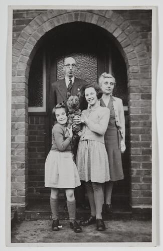 Black and white photograph of George and Gertrude Palmer and their daughters Shirley and Lesley, and their dog Robbie, in England around 1947. It was probably taken at George's sister's house in Iver, Buckinghamshire by George's brother-in-law David Roberts, the day before they left for Australia. It was brought to Australia by George Palmer when he migrated to Australia from England with his wife Gertrude and their two daughters, Shirley and Lesley in 1947.