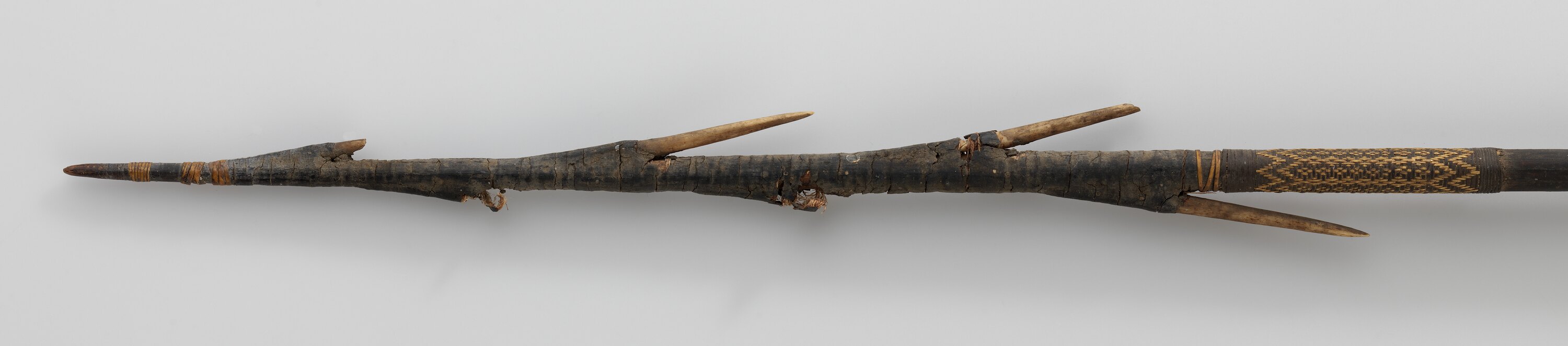 Split cane spear exhibited at the 1880 Melbourne International Exhibition. Many functional and ornamental native weapons were displayed in the various colonial settlement courts. It is noted in the Official Record of the Melbourne International Exhibition that British colonies such as the Straits Settlements, were represented by 'a fine array of weapons used by the Malays and by natives of Borneo, Java, Sumatra, and the Eastern Archipelago' (cxxxvi); and similar displays were seen in the Fiji and Cape Colony courts.