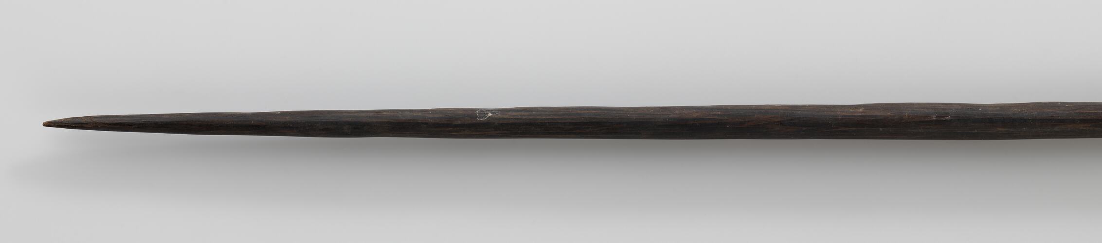 Split cane spear exhibited at the 1880 Melbourne International Exhibition. Many functional and ornamental native weapons were displayed in the various colonial settlement courts. It is noted in the Official Record of the Melbourne International Exhibition that British colonies such as the Straits Settlements, were represented by 'a fine array of weapons used by the Malays and by natives of Borneo, Java, Sumatra, and the Eastern Archipelago' (cxxxvi); and similar displays were seen in the Fiji and Cape Colony courts.