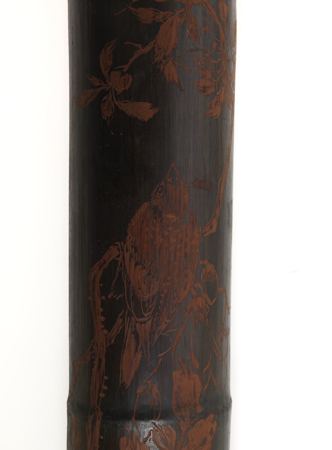Ornamental bamboo carving has a long tradition in both China and Japan. The motifs used on this example of the peony, magnolia and Chinese crabapple represent flowers that had long been revered by both cultures. In China, peonies were known as the king of all flowers and since the Tang dynasty have become a favourite motif used by artists. They are often used in art to represent wealth and elegance.
