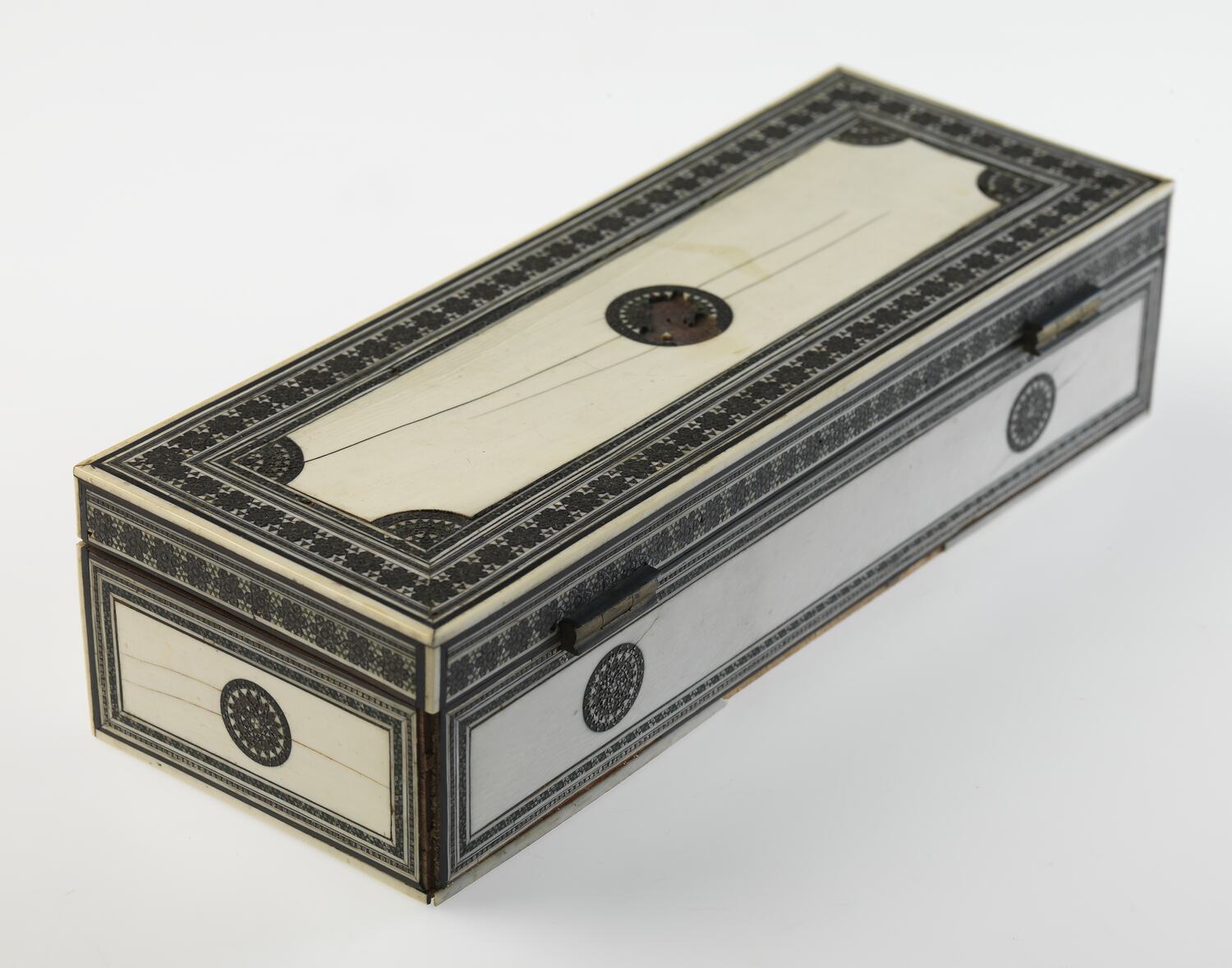 Rectangular box. Ivory panels on wooden frame inlaid with mosaic of metals. At centre of each panel, star motif. Each panel framed with stylised floral band. Hinged at back. No markings.