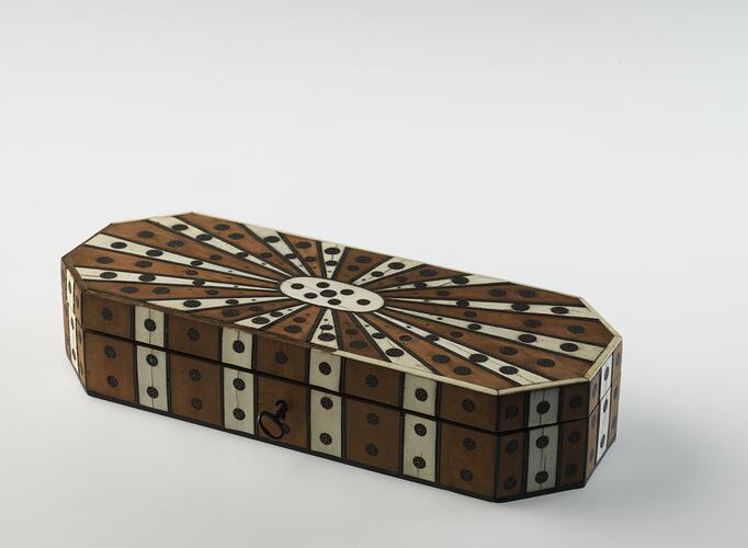 Elongated octagonal box. Lid alternating panels of wood and ivory radiating from central oval panel. Sides similar alternating panels. All inlaid with metal roundels. No markings.