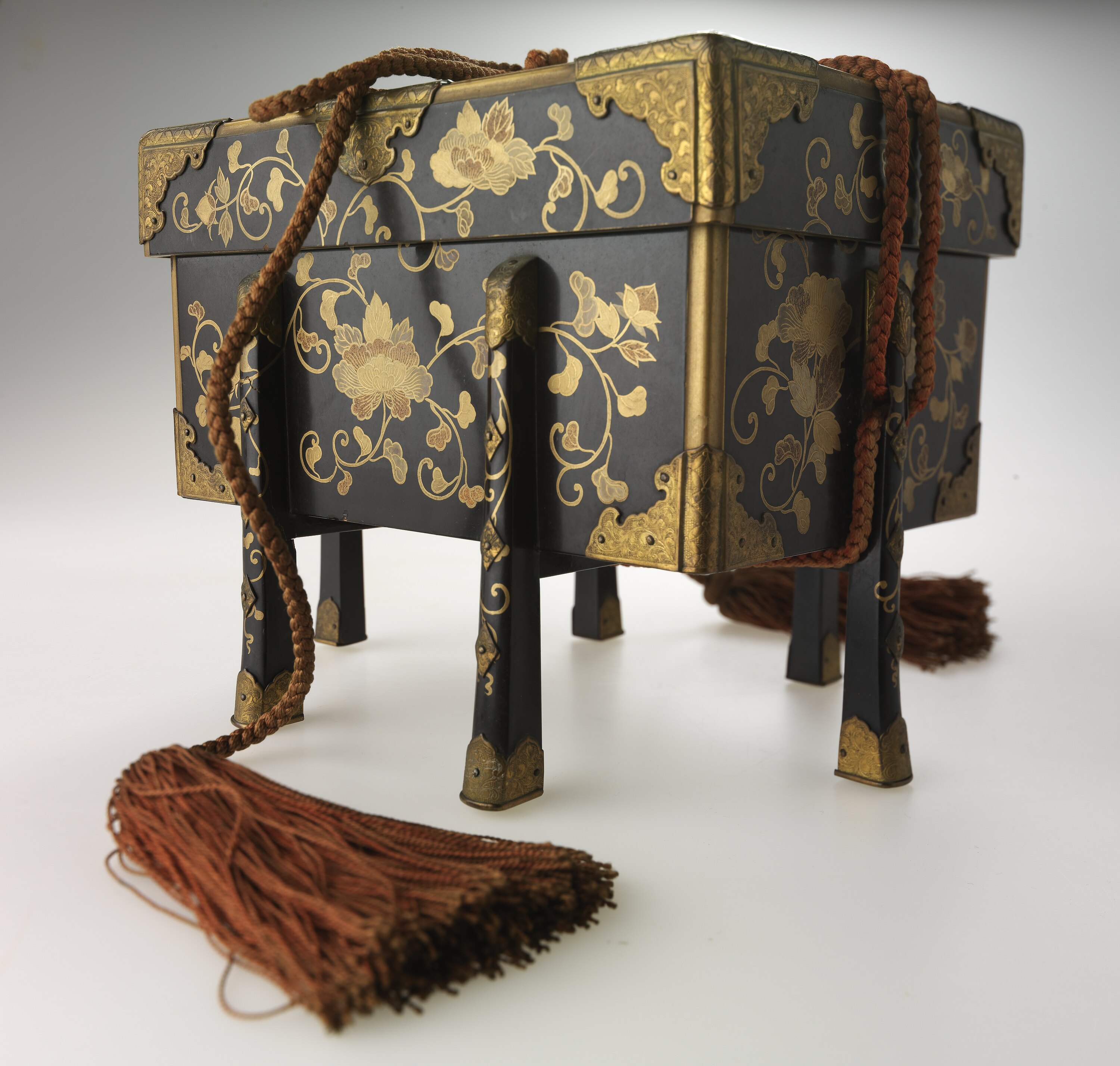 A Karabitsu is traditionally a six-legged Chinese-style chest, used for the storage of samurai armour. The term derives from the Japanese word 'Kara', meaning 'China', and 'Ko', the Japanese word for 'small'. Because of its size, this Ko-Karabitsu was probably used to store personal items or cosmetics.