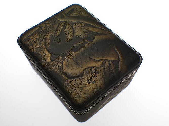 Such associations would be used on products designed for men, and this lacquer box may have been used as a cigar case. Chuji Nishiwaki exhibited a range of lacquered cigar cases at the 1880 Melbourne International Exhibition under class 29, including Leather-work, Fancy Articles, and Basket-work. Nishiwaki's exhibits, manufactured in Fukui in Japan, won the fifth order of Merit for lacquered ware in Jury Section 14.