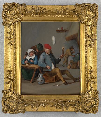 Oil painting on tin showing a tavern scene. A man sits at the end of a table with a glass of ale upheld in his left arm, and woman sits at the table filling a cutty (pipe) with tobacco from a bowl, another man looks over her shoulders. Another pair of drinkers in the background. Framed in an ornate, gilded gesso frame. No signature.
