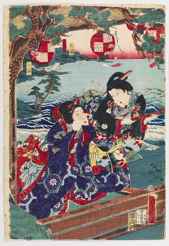 In this image, two female attendants are seen seated on what appears to be a short pier at the edge of the bay with lanterns hanging in a tree above them. In the full composition, including the central and right panels of the triptych, Genji travels to Enoshima Island (Kanagawa prefecture) with attendants, with the Izu peninsula (Shizuoka Prefecture) visible in the background of the right panel.