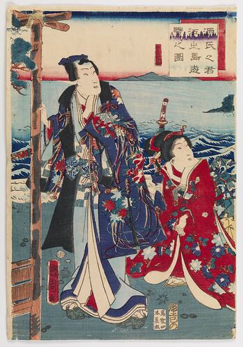 Woodblock print on paper, depicting Prince Genji and a female attendant on the shore of Enoshima Island, with the Izu Peninsula in the background, produced by the Japanese woodblock artist Toyohara Kunichika (1835-1900), carved by Mi no and published by Kiya Sojiro in Tokyo, Japan, in October 1863. It is the central panel of an original triptych; a work of art comprised of three distinct panels, titled 'Genji excursion to Enoshima Island' (Genji no kimi Enoshima Yuran no Zu).