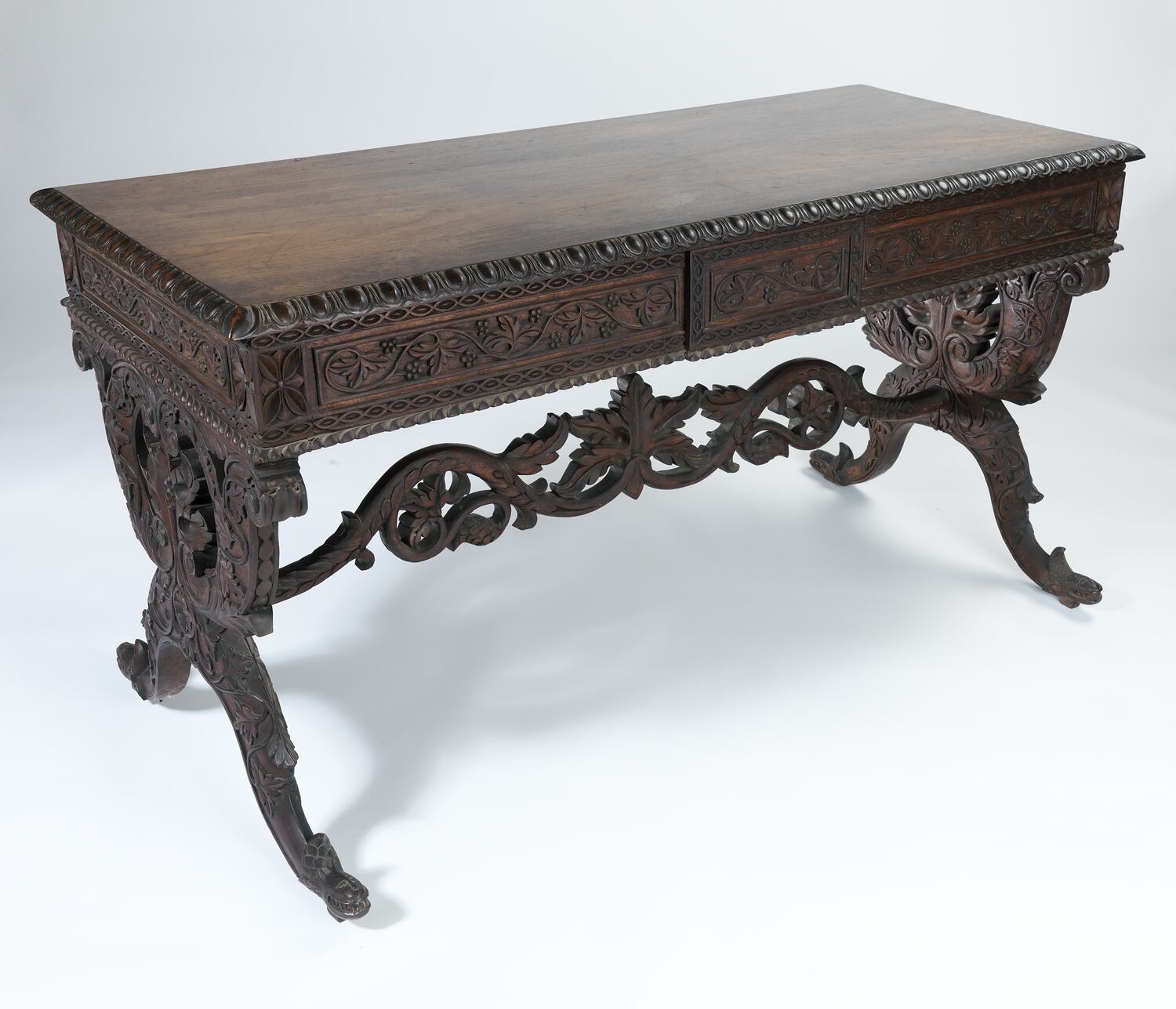 Ornately carved side table. Curved X legs one either end with ornate stretcher. Carved around base of table top grapes and vines below egg and dart motif. No markings.