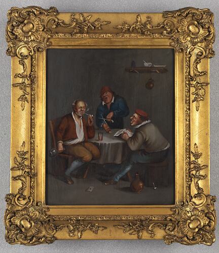 Oil painting on tin showing a tavern scene. Three men sit around a table draped with a cloth. On reads a paper, one holds two long stemmed pipes in his hand, the other a long stemmed pipe in his mouth and a flagon in his hand. Framed in an ornate, gilded gesso frame. No signature.
