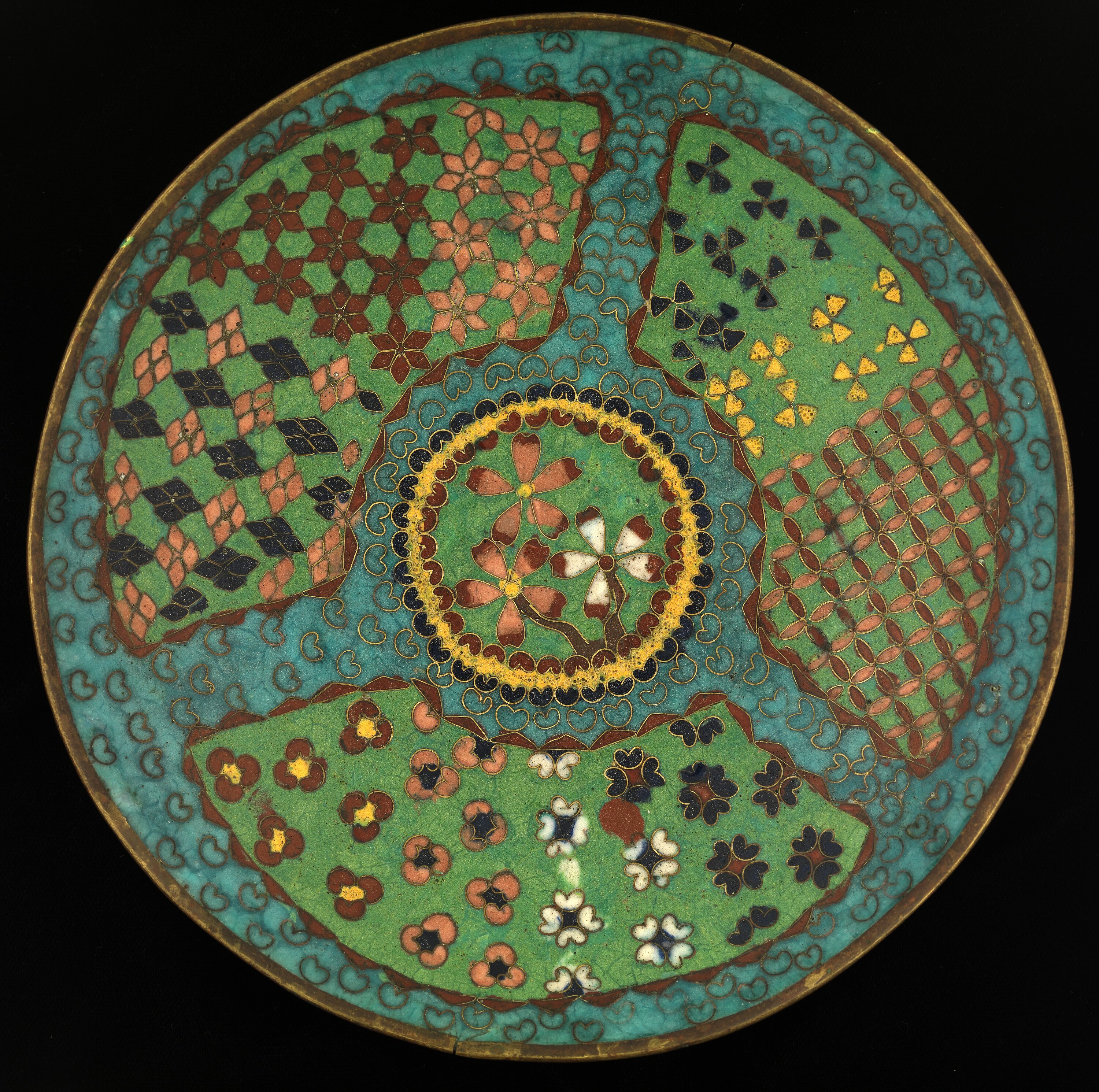 Shallow bowl, copper rim, blue background with three panels with green background decorated with floral patterns in reds, pink, white, blue, etc. Base green with floral patterning.