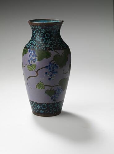 Tapering cylindrical with wide lip. Decorated around neck and base with dark blue ground and stylised floral motif. Body decorated with lilac background covered in vines laden with indigo blue grapes. No markings.
