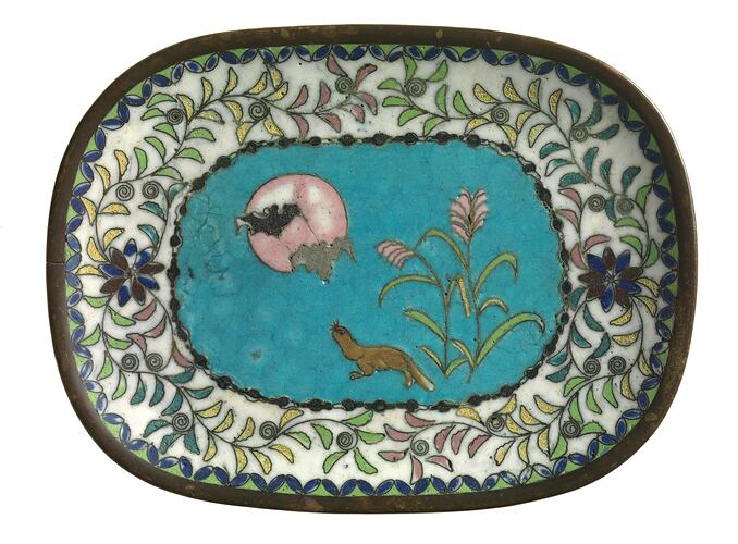 Cloisonné tray featuring bats and an otter within a floriated border. Manufactured in Nagoya, Aichi Prefecture, Japan, in the early Meiji period (1868-1880).