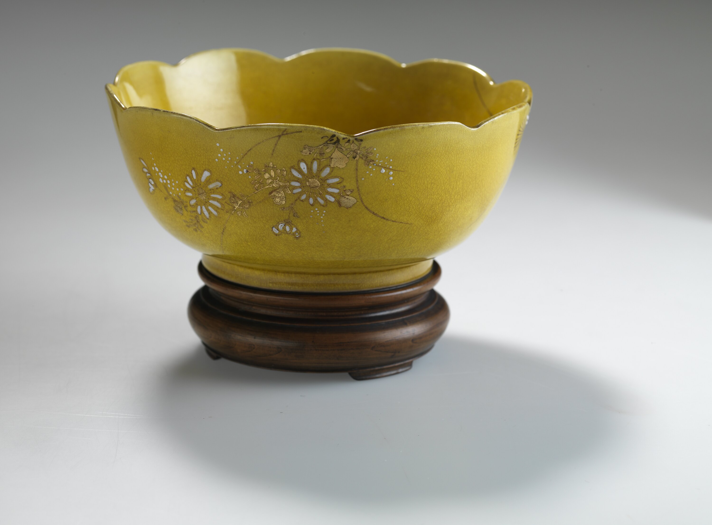 Porcelain bowl on wooden stand featuring a gilded design of golden butterflies and flowers on a base of imperial yellow, manufactured in Japan during the early Meiji period (1868-1880).