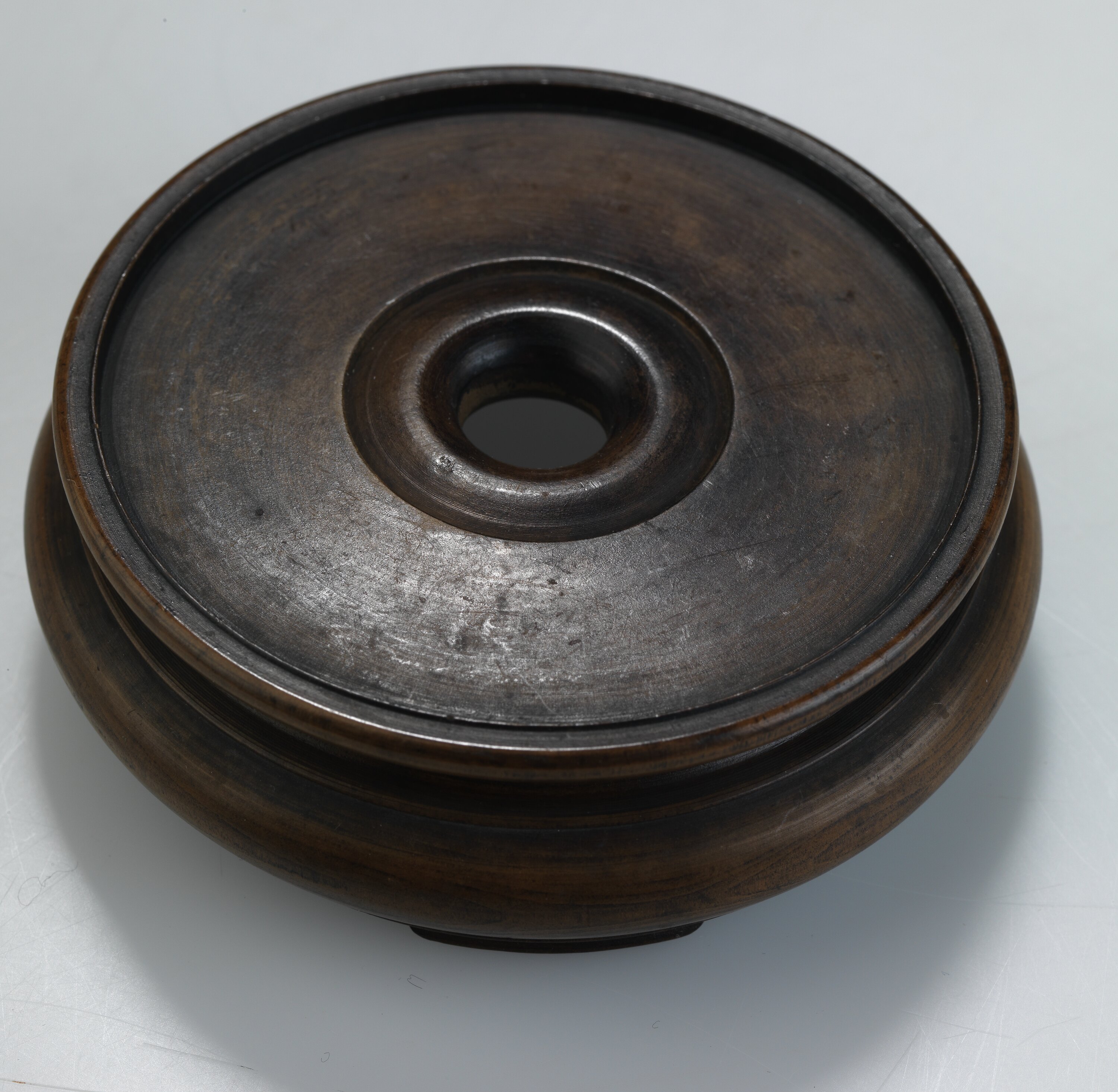 Round wooden foot stand with three low feet. No markings. Slight hairline crack.