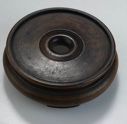 Wooden stands such as this were manufactured for the Western market. Acting as a miniature plinth, the stand would elevate the bowl into a higher form of art, which was a very attractive idea to the Western World. British designer Christopher Dresser adopted the form in his Japanese inspired designs for Minton pottery; he created vases with integral plinth-like bases.