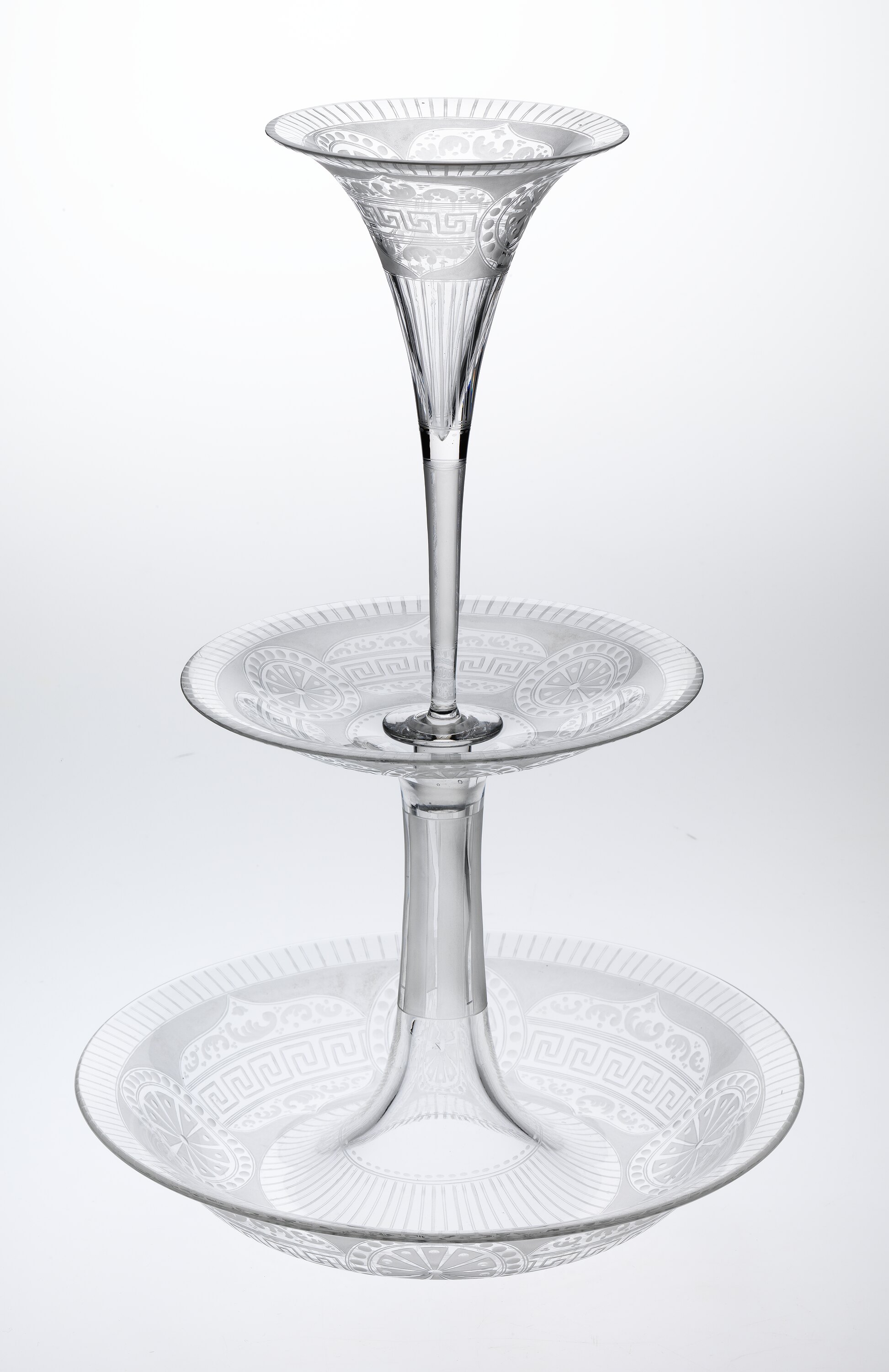 Tapering fluted vase centred in footed shallow dish above deeper bowl. All etched with Grecian key pattern, wheels, and circles. In two parts, vase sits in middle bowl.