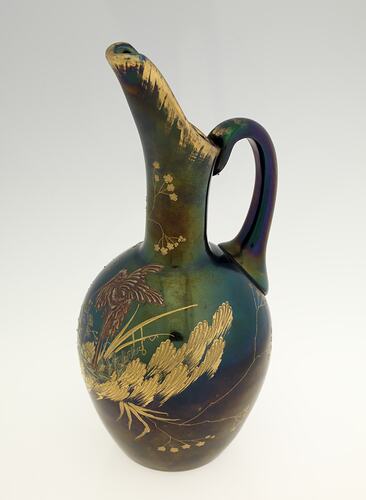 Single handled ewer with fluted spout and slightly bulbous body. Lustered finish in very dark green/ black, enamelled in relief in gold, green and brown with an image of a stork among leaves.