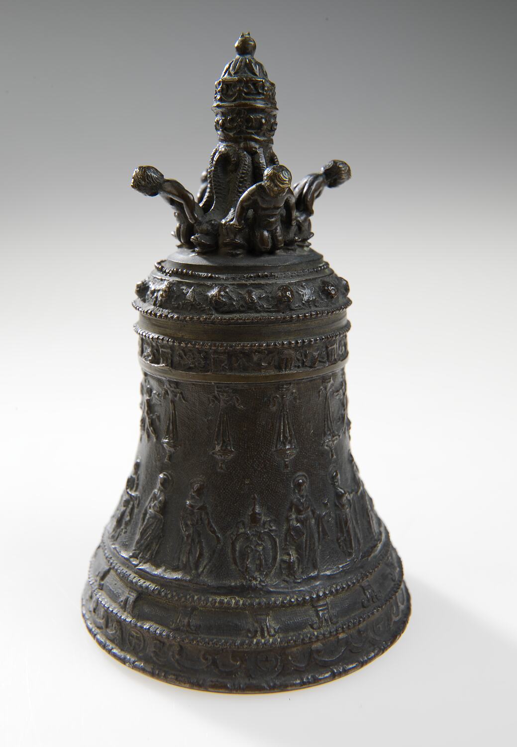 Tapering out cylindrical bell with four putti around finial at top. Around body of bell a religious processional below hanging lamps and flying putti. Two medallions with portrait busts and heraldic shields (indistinct).