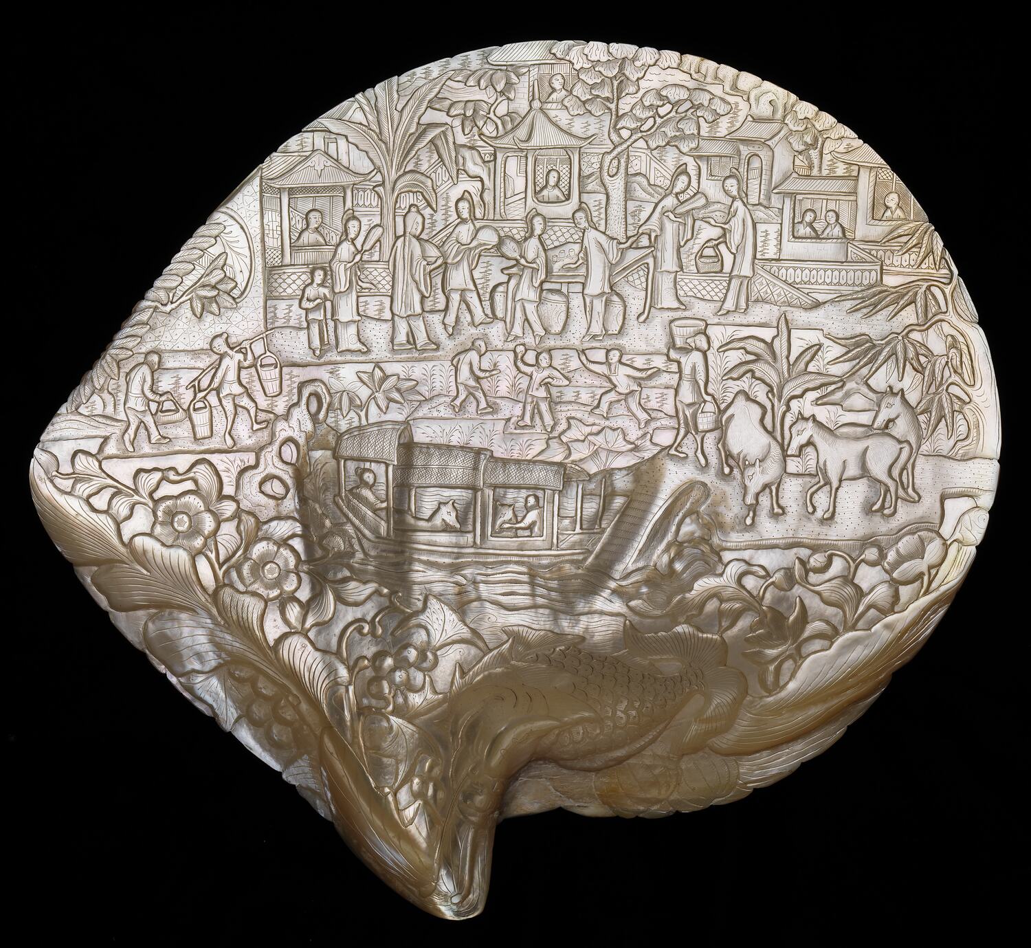 Large mother-of-pearl shell, carved on one side with intricate scenes of everyday life.
