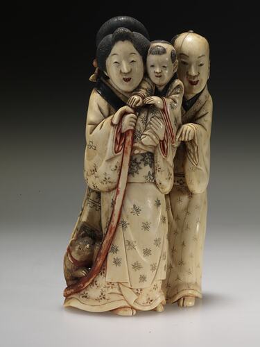 Group comprising mother, father, child and dog. The mother is holding the child in her left arm, between herself and the father. The dog is sitting on her skirt tail. Decorated with black etching and red highlights. At first glance, it appears that the ivory is very discoloured, however, upon closer inspection, and when viewed with the black and red stained ivory in mind, it is more likely that the ivory has been tea stained by the manufacturers to achieve different depths of colour in the overall design.