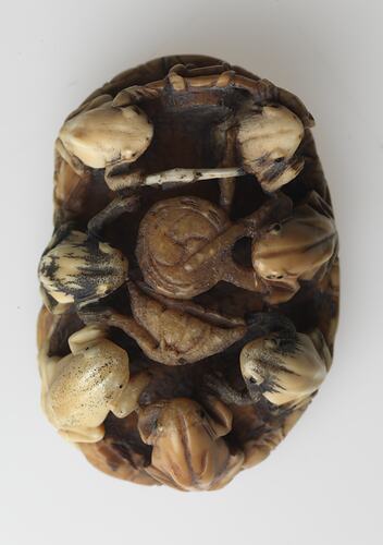 Small oval lily pad, with seven frogs sitting around a leaf. The underside carved as a lily with a frog. At first glance, it appears that the ivory is very discoloured, however, upon closer inspection it is more likely that the ivory has been stained by the manufacturers to achieve different depths of colour.