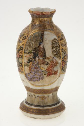 Miniature vase. Rounded hexagonal vase with gilded decoration and two panels showing upper class people of the Heian (794-1191) and Edo (1600-1867) periods being entertained.