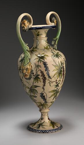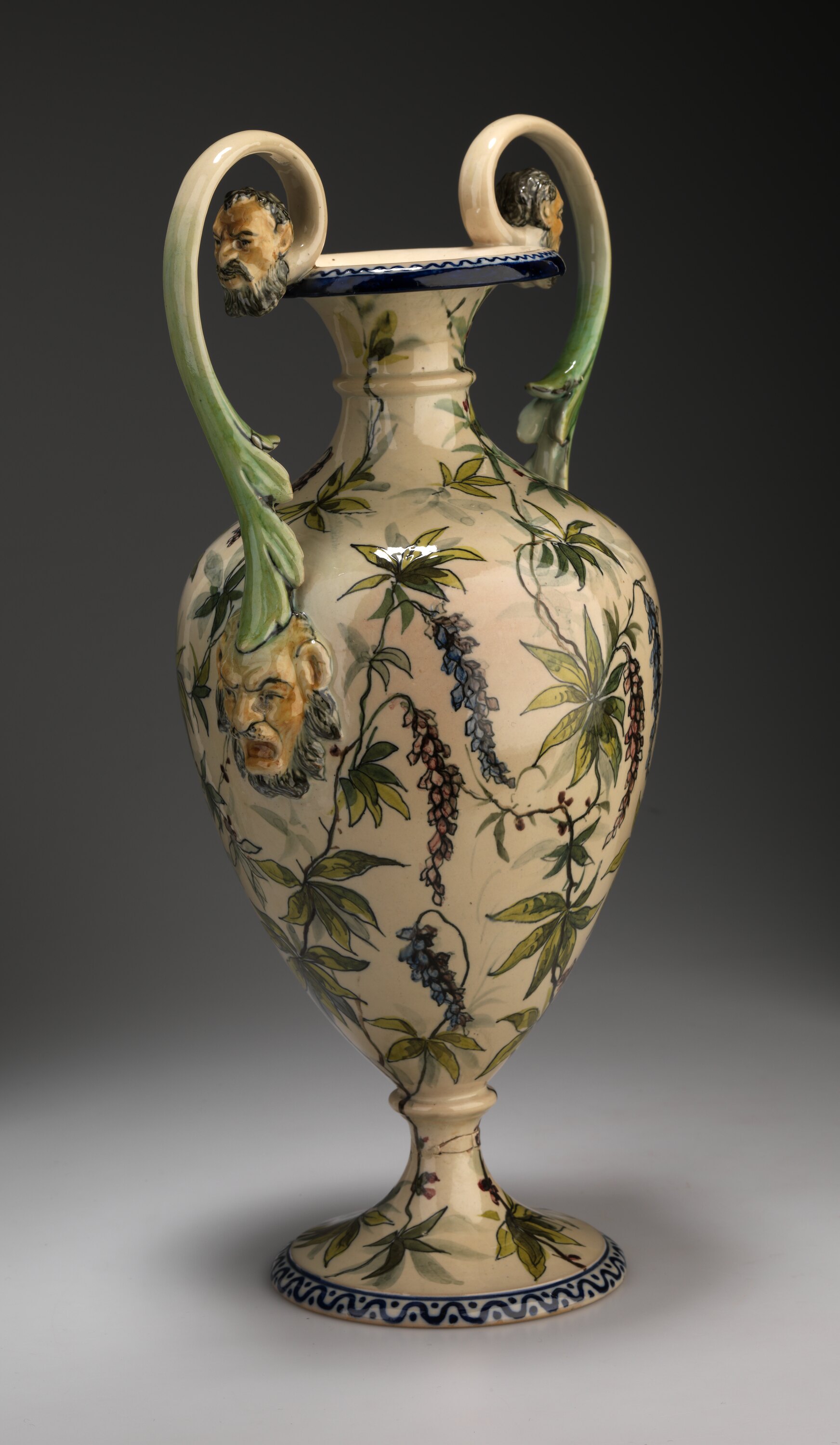 Double handled amphora. Cream underglaze painted all over with wisteria plants. On the front, a naturalistic realisation of a parrot. The handles meet the rim and body with satyrs heads. Damage to the foot and handles.