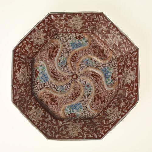 Decorative plate. Octagonal slightly raised rim above shall bowl. Around rim, a red background with stylised flower and leaf motif. In the bowl, a wheel with 8 curving spokes in orange interspersed with geometric and floral motifs in reds, blue and green.