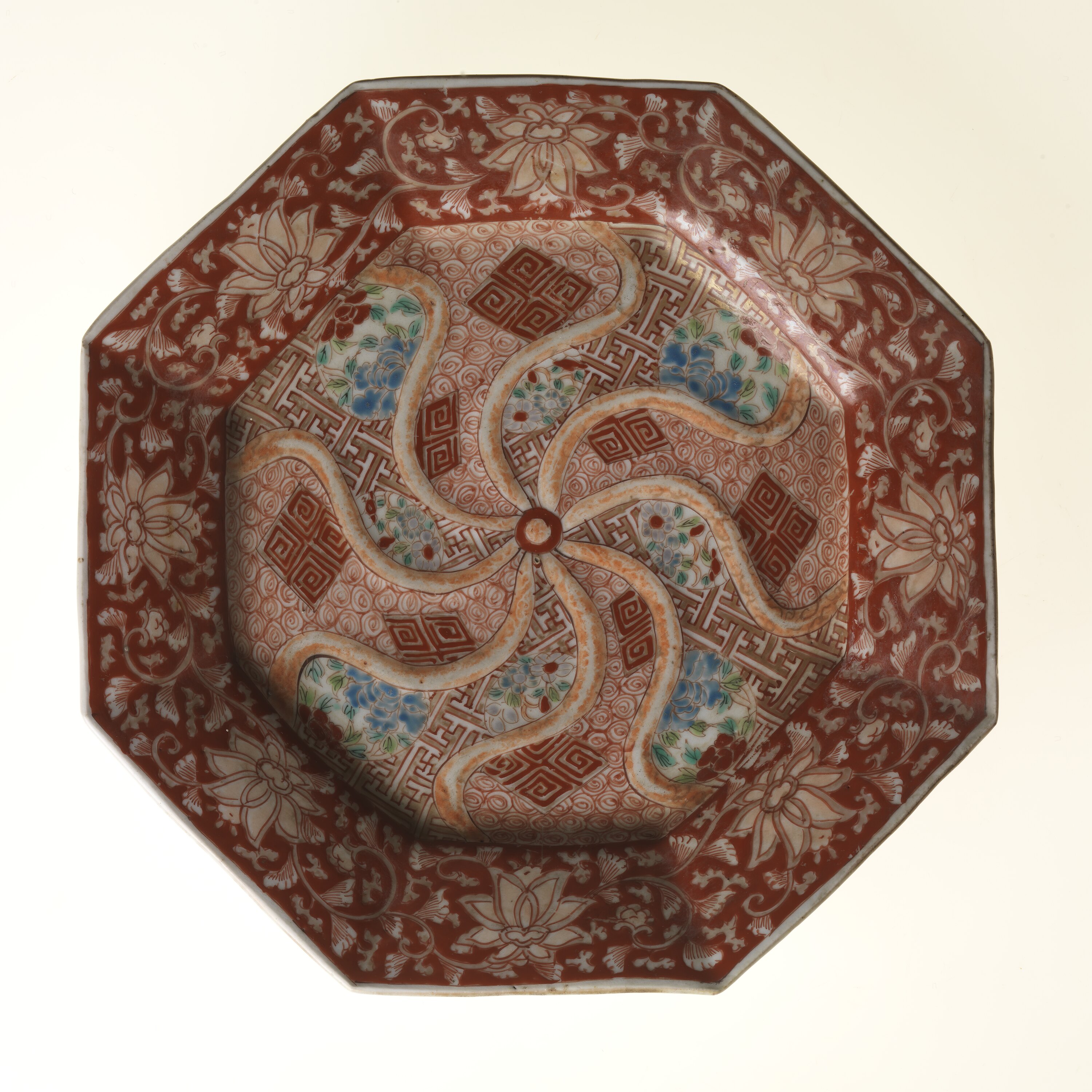 Decorative plate. Octagonal slightly raised rim above shall bowl. Around rim, a red background with stylised flower and leaf motif. In the bowl, a wheel with 8 curving spokes in orange interspersed with geometric and floral motifs in reds, blue and green.