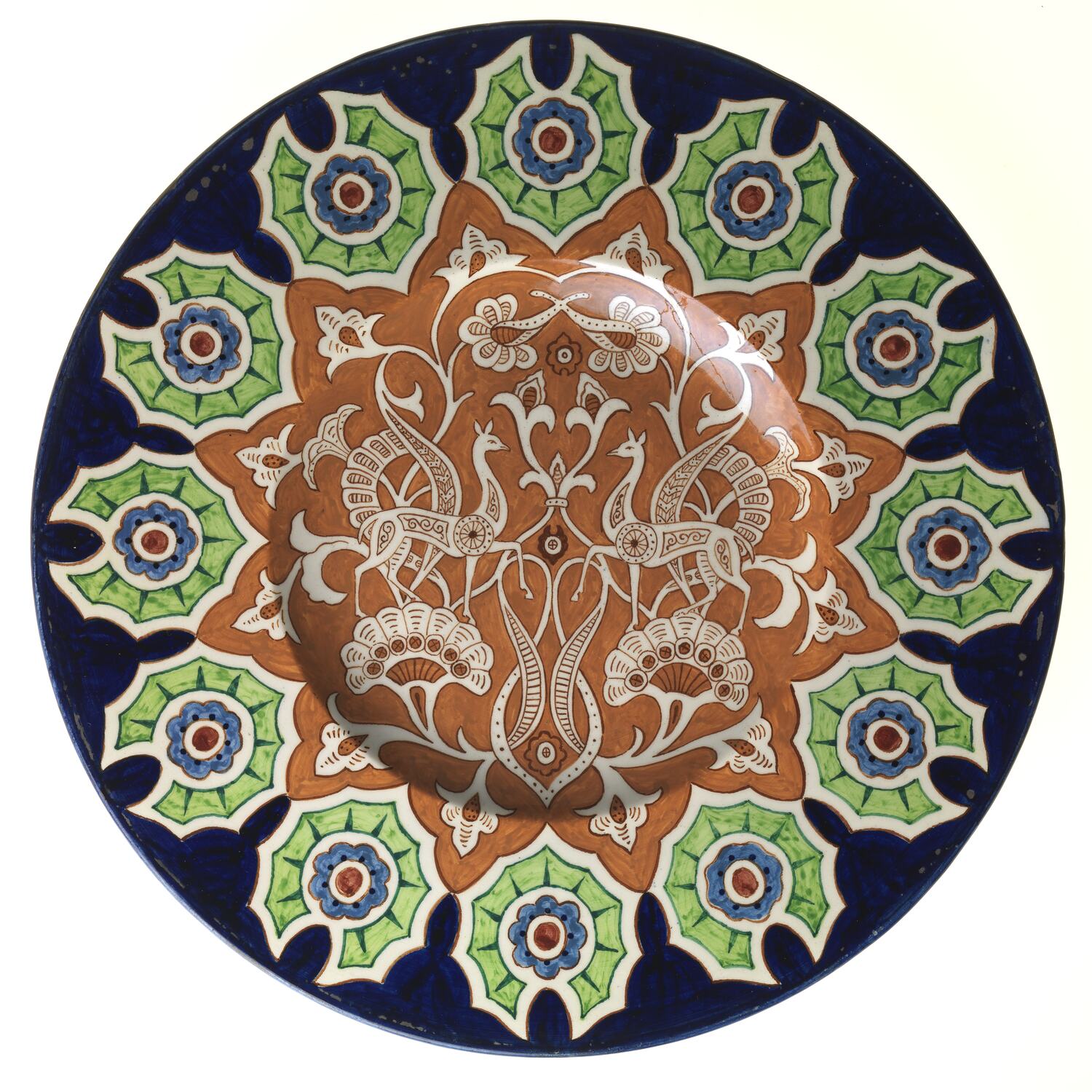Italian majolica tin-glazed charger with an Islamic-inspired design, manufactured in Rome by Torquato Castellani, circa 1880.