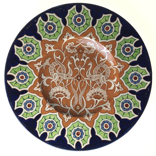 Olga and Torquato Castellani were active in the late 19th century. It is claimed they developed modern production techniques. This is shown in the way this charger was manufactured. Created from a mould, the decoration was transfer printed, then over painted by hand. This approach in effect enabled the Castellani workshop to mass produce their work.