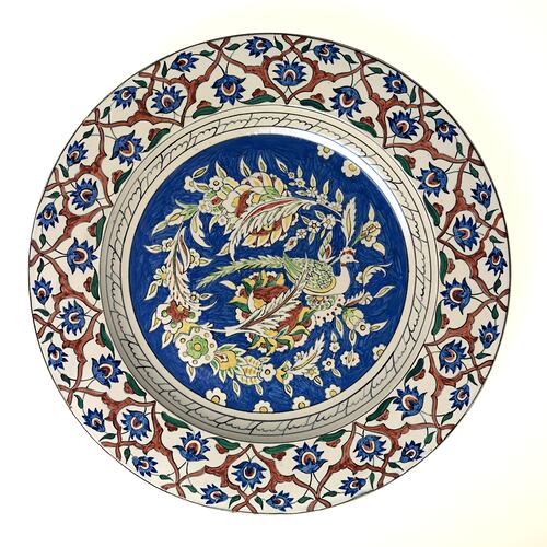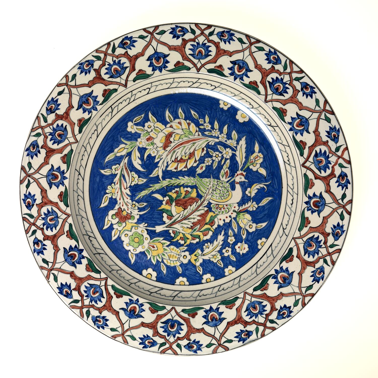 Earthenware charger, the centre painted with partridge and flowers. The rim with a stylised motif of flowers, leaves, and branches in blue, brown and green. Iznic style.