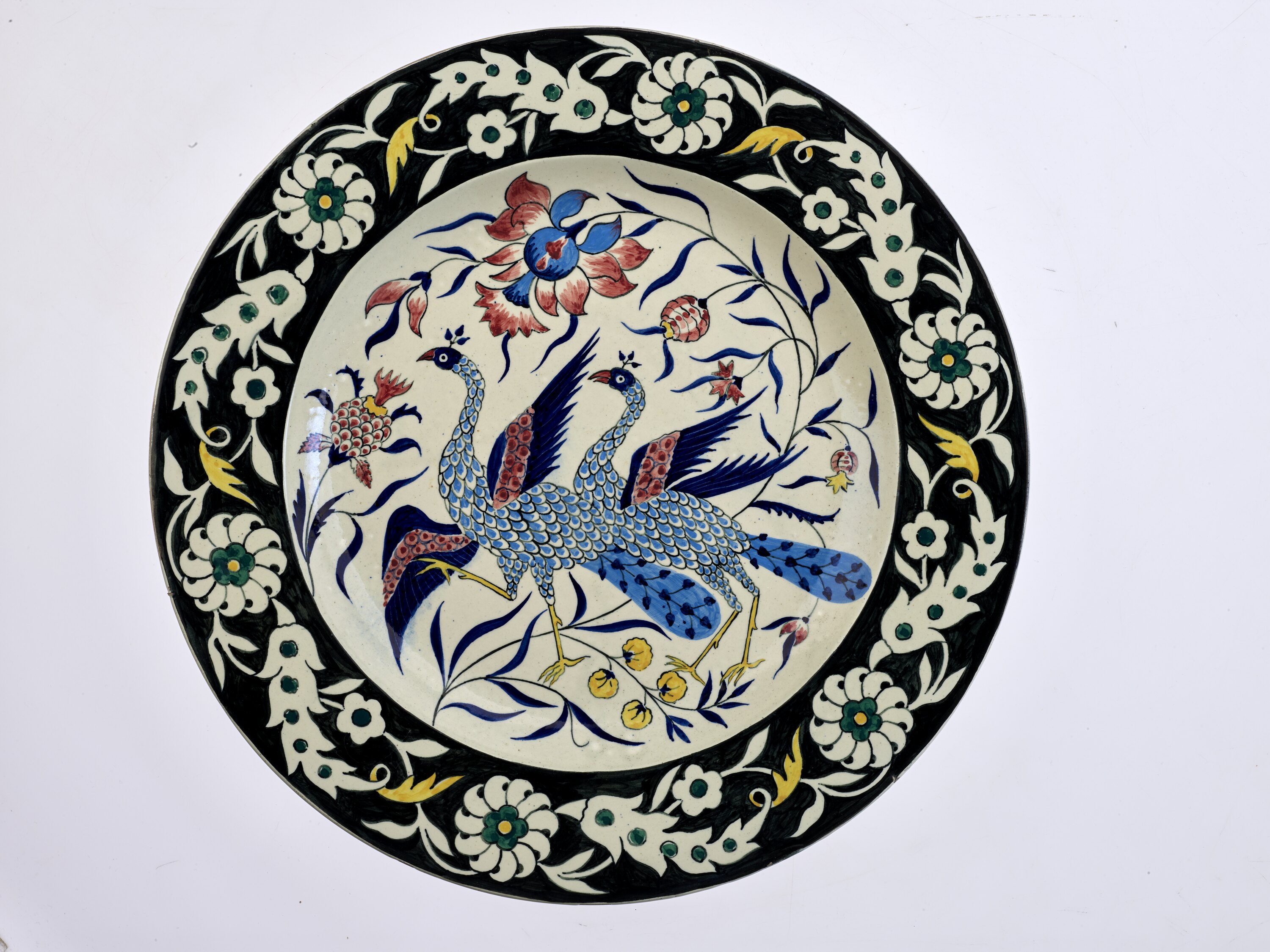 Tin-glazed earthenware charger, the centre painted with two blue peacocks and flowers. The rim painted with flowers and leaves in white, yellow and green, on black border. Iznic style.
