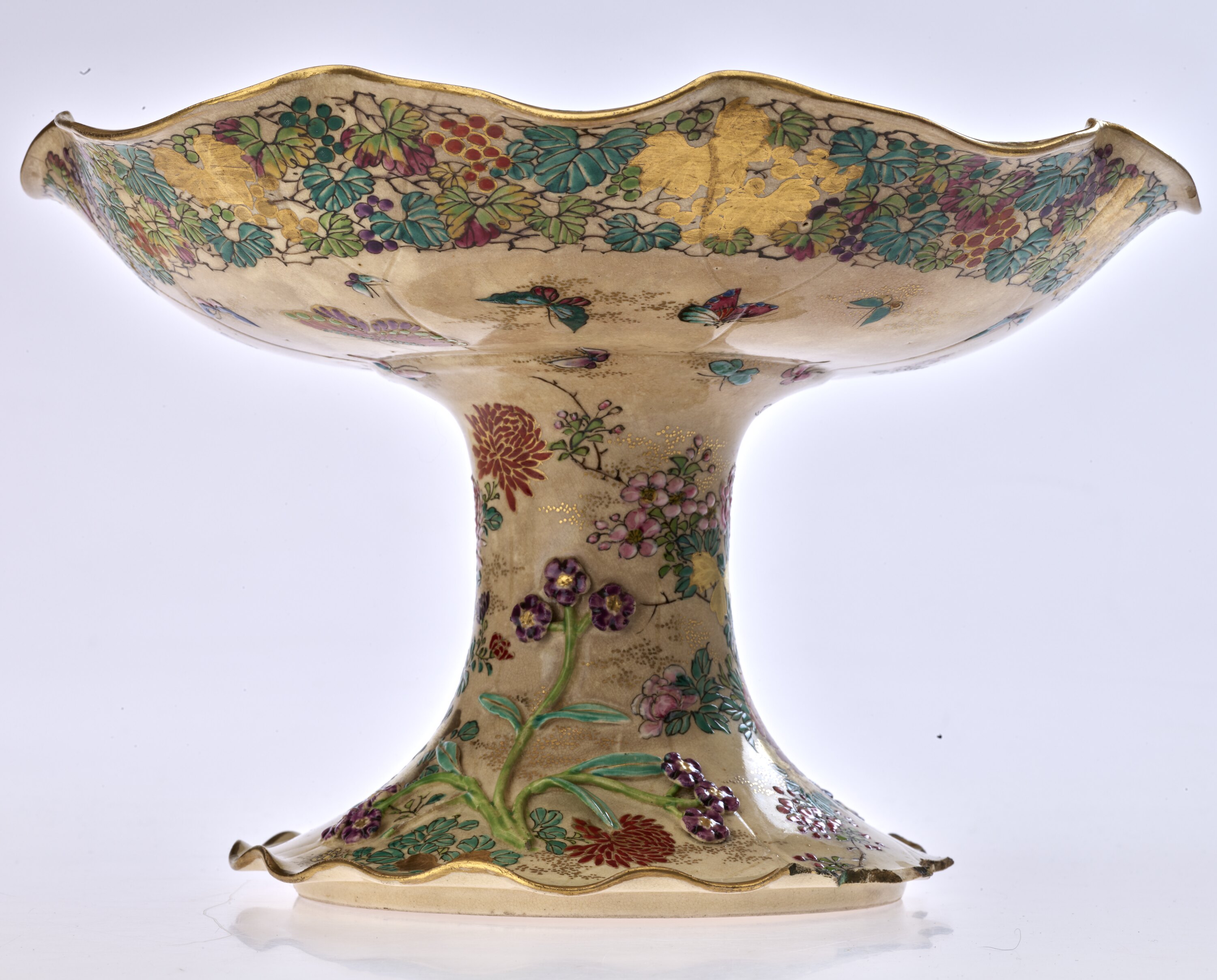 Shallow bowl with fluted edges on cylindrical neck tapering out to fluted foot. Painted all over with birds and flowers in naturalistic colours, highlighted in gold. Moulded flowers and leaves applied to neck and foot.