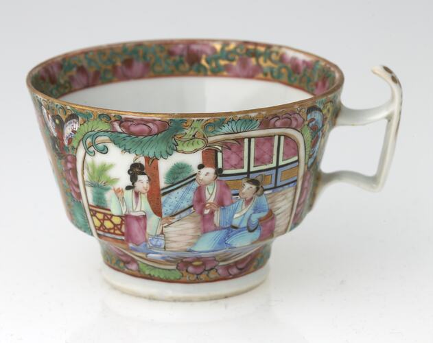 Earthenware tea cup. (One of two) Each teacup has a decorative floral design in green, pink, russet, blue and cream. Painted stems, leaves, and flowers border three 'window' designs. One window depicts a bird, insects, flowers and butterflies, another a duck on a lake, and the last an interior scene with figures in opulent costume. Some gilding appears to have originally been on the rim of each cup, but has rubbed off with use.