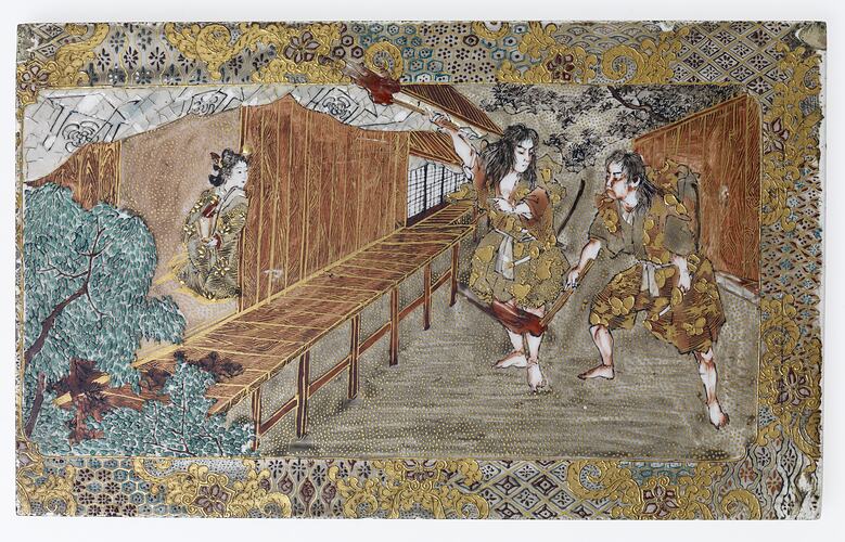 Tile, ceramic. Depicts a scene of invasion, within an intricate floral and geometric border. Two men stand outside a house waving flaming torches. In the doorway to the house, partially hidden from view, a richly dressed Japanese courtesan is leaning, watching their actions in alarm. Tile is gilded and intricately painted in russets, greens and gold.