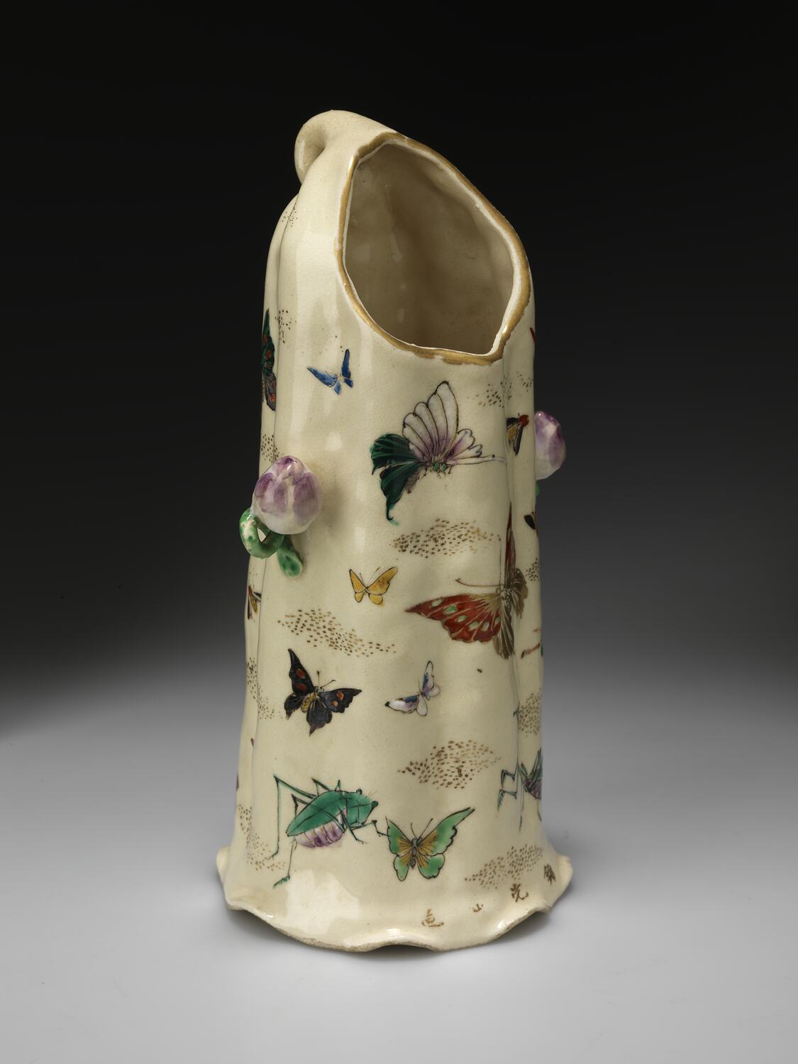 Cream vase in shape of tree trunk, painted all over with insects and butterflies. Two moulded flower buds in lilac and green attached to vase's side. Opening to side of neck not top.